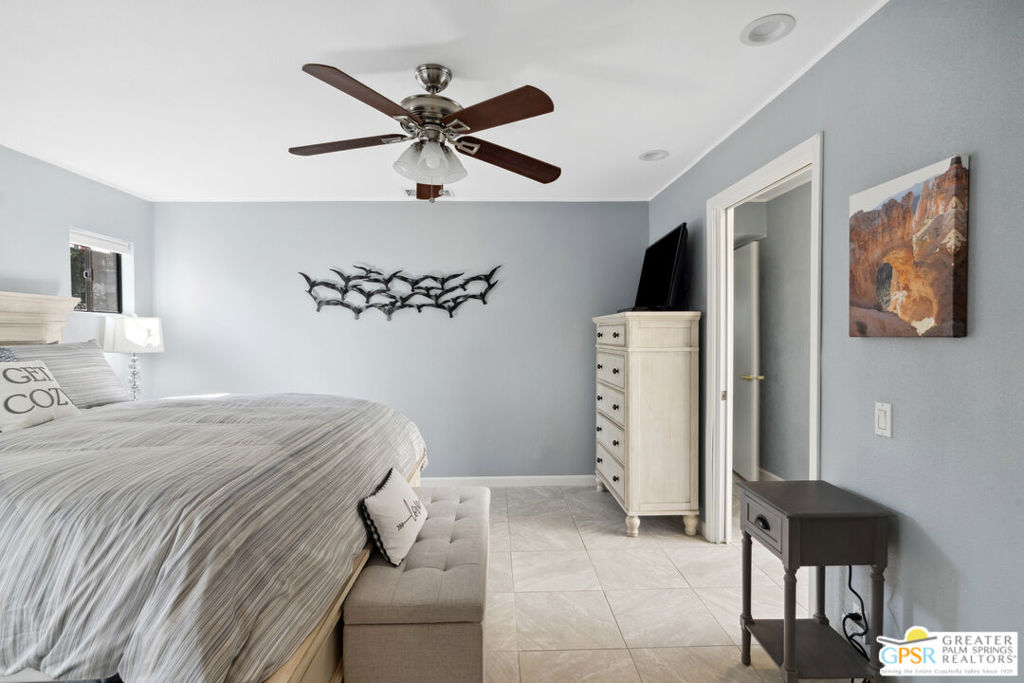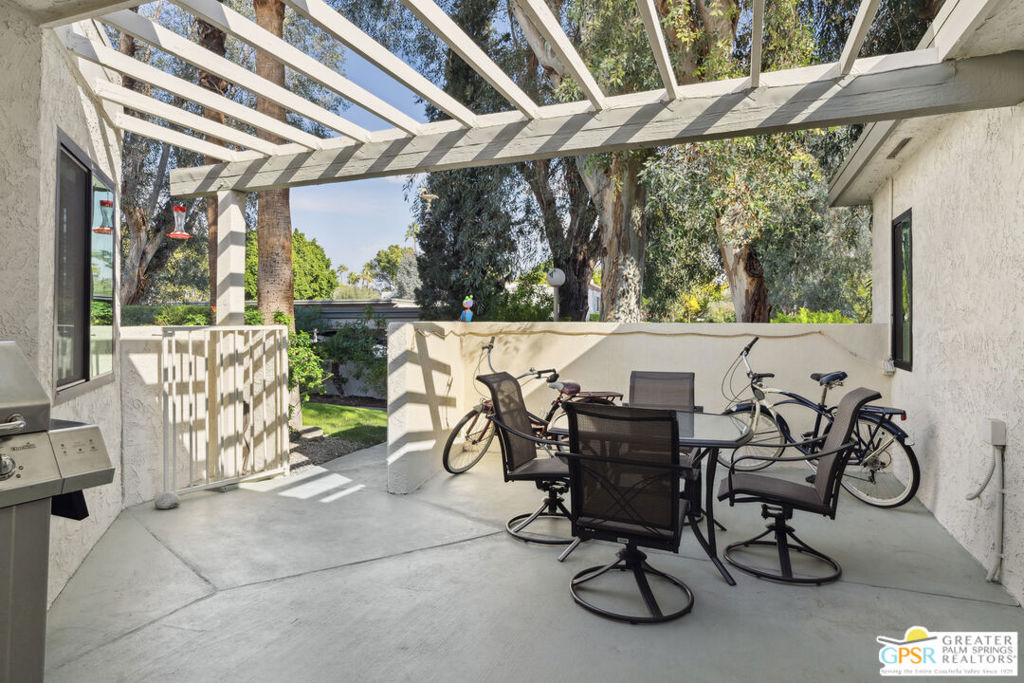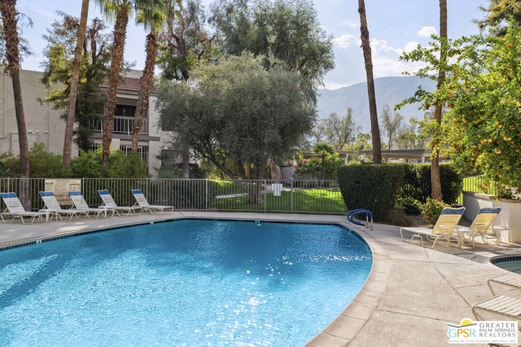 This villa-style condo with no unit above offers a unique and private living opportunity in the sought-after community of Riviera Gardens and comes furnished. 1,183 square feet of living space encompasses an updated open-concept main living area that is bathed in natural light from south facing bay windows and perfect for entertaining guests. The kitchen is completely renovated, spacious, light and airy with plenty of custom cabinetry, and open to the dining and living area. The primary bedroom lives large with space for a king size bed, additional seating, a walk in closet and access to the outdoors. The attached en suite bathroom is completely renovated and offers a huge walk in shower and separate vanity area. The guest bedroom has plenty of natural light and its own en suite bathroom. Outside you'll find two expanded private patios on the east and west sides of the home, the perfect spot for al fresco dining or morning coffee. This end unit condo is in a quiet interior location, directly adjacent to a community pool, and has near direct access to its parking spot. This home also has new* windows and doors. Riviera Garden's meticulously landscaped surroundings create a sense of seclusion while still being in close proximity to the vibrant energy of Palm Springs. Residents enjoy access to private amenities like a sparkling mountain view pool and spa